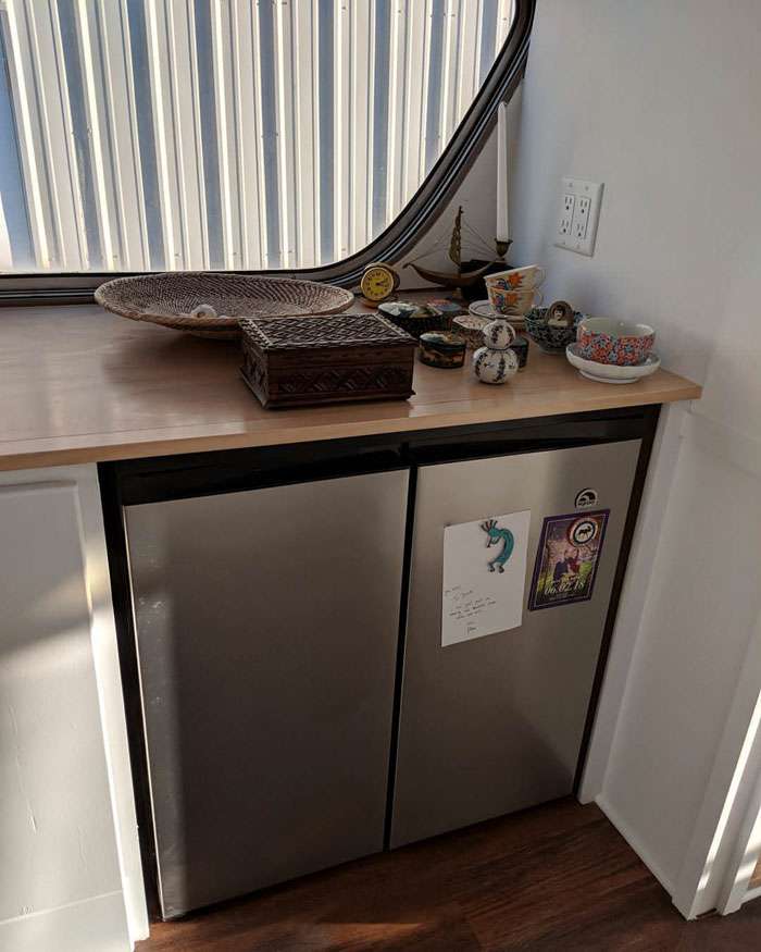 ▼礙於車廂的高度,車上只能放這樣的小冰箱。
