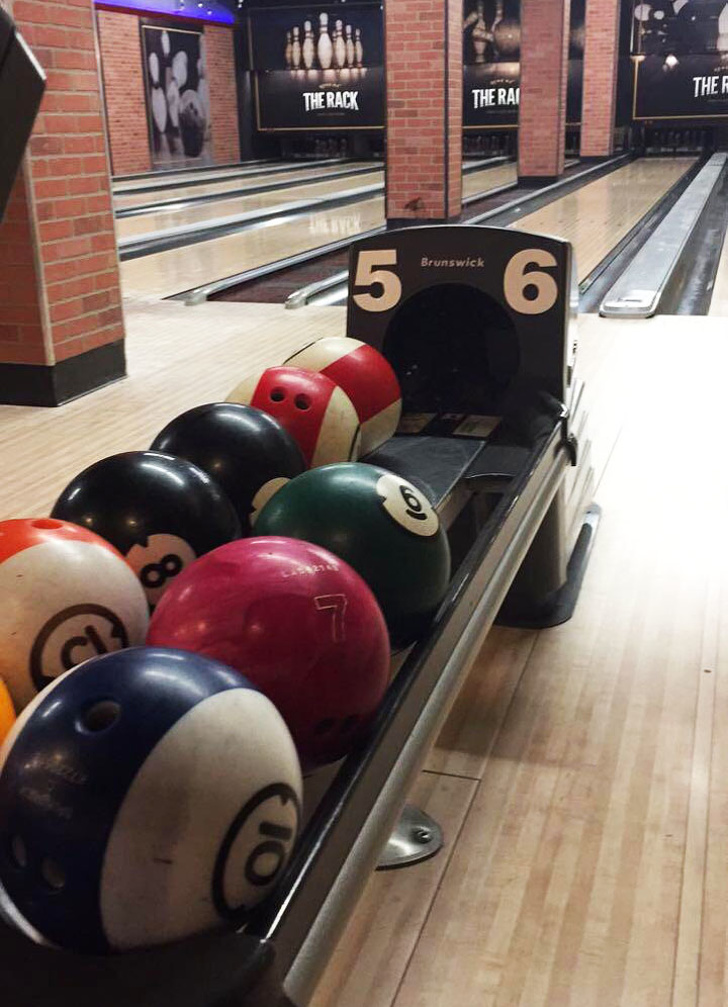 ▼他們把保齡球設計成了撞球的模樣。