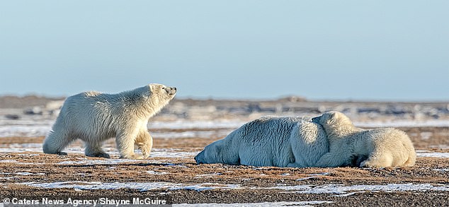 ▼2015年時,阿拉斯加州還有暴風雪,雪也很厚,後來雪越來越少,冰也漸漸消失了。小北極熊的家人蜷縮在地上睡著,牠卻坐在那裡合掌祈禱,似乎在說:「冬天快點來,多下一點雪吧。」