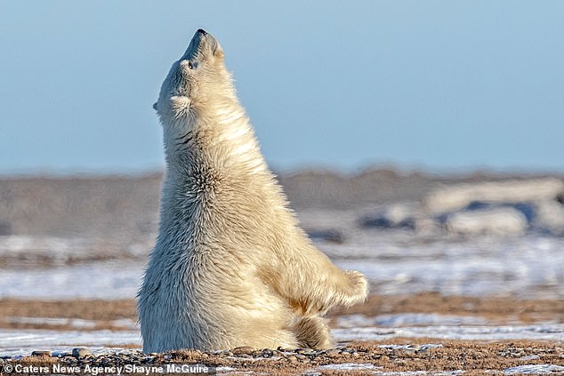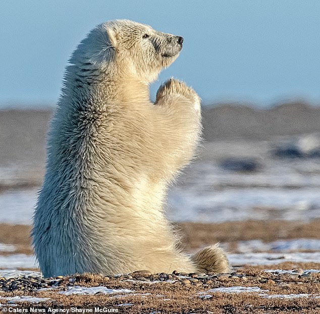 ▼攝影師Shayne McGuire在美國阿拉斯加州的巴特島(Barter Island)遇到了一隻北極熊寶寶。牠正坐在稀薄的雪地上,雙掌合十仰面朝天,好像在認真祈禱。