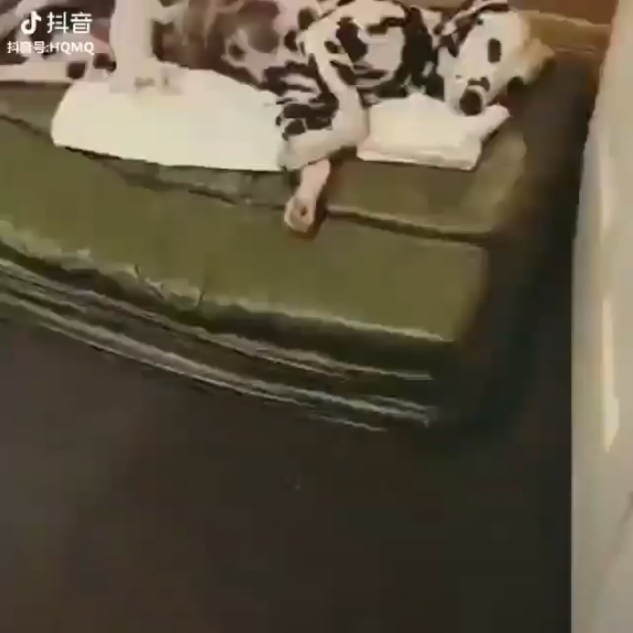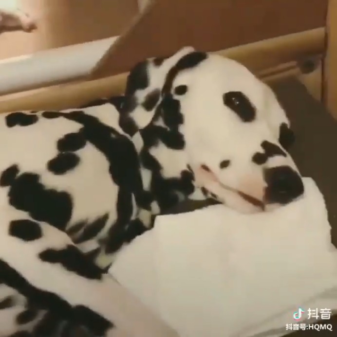 ▼影片中可以看到一隻精疲力盡的斑點狗媽媽正平躺在沙發上,身上還有一個瘋狂蠕動不斷左右搖擺的小東西。