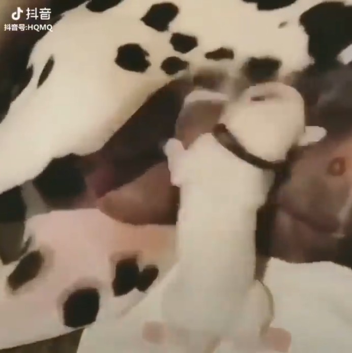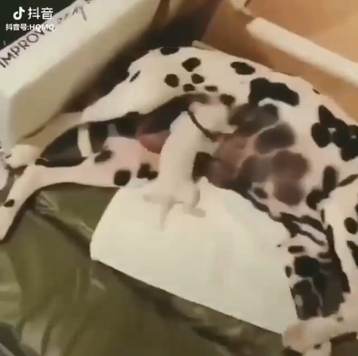 ▼仔細一看才發現原來是狗媽媽剛誕下不久的小狗狗,正趴在她的身上搖頭晃腦的吸奶。