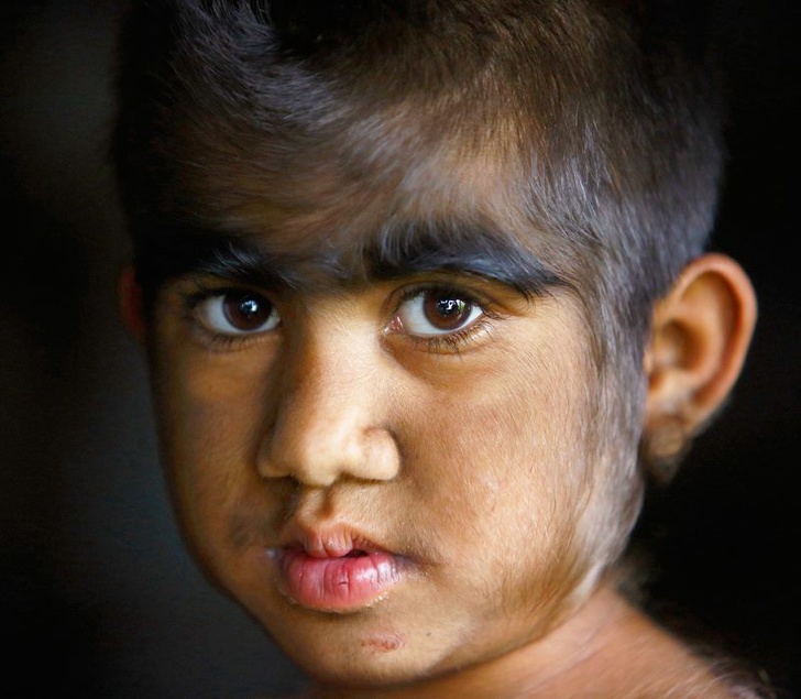 ▼9.住在尼泊爾山區的Budhathoki患有狼人綜合症,家庭成員也跟他一樣。母親與孩子們都有不尋常的頭髮,而且還有罕見的先天性高血脂症 。
