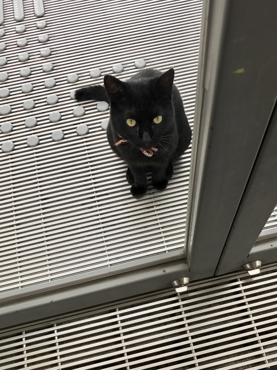 ▼隔幾天後,一隻黑貓出現了。難道橘貓改變策略,開始玩變裝了?但你被警衛攔阻不是因為橘色的皮毛,而是因為你是貓,而且沒買票啊。