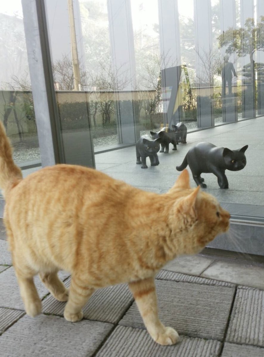 ▼現在以貓咪為主題的展覽早就結束了,但橘貓和黑貓已經變成了美術館的鄰居,也是常客。警衛上崗的第一件事,就是被告知要小心這兩個逃票的小傢伙。