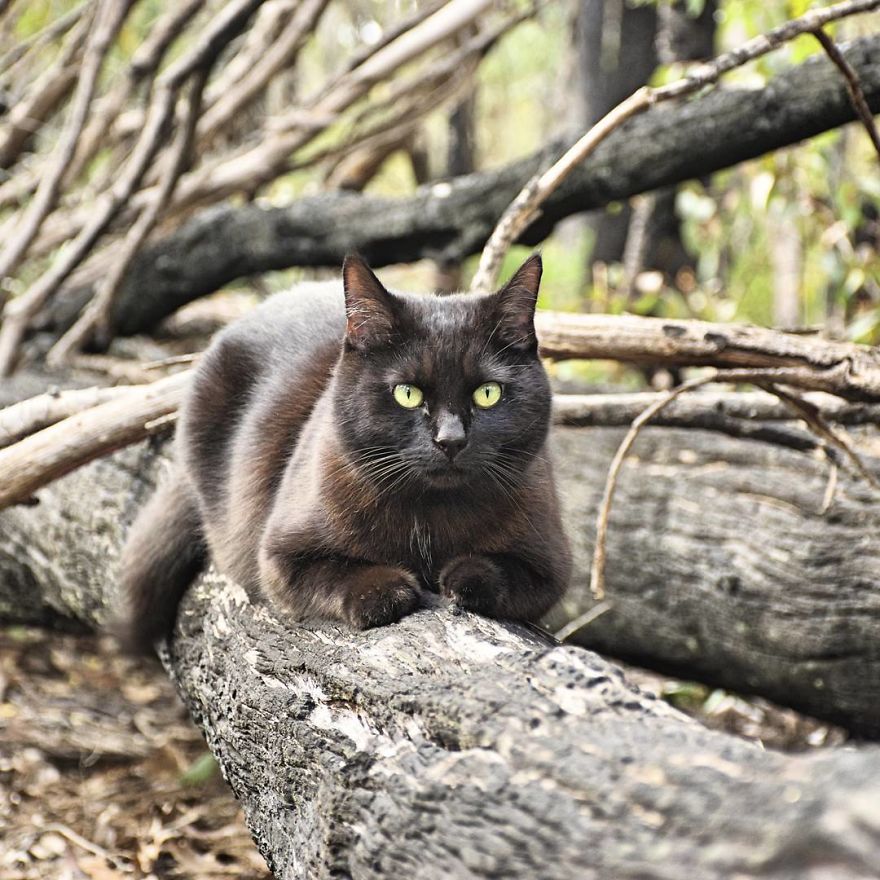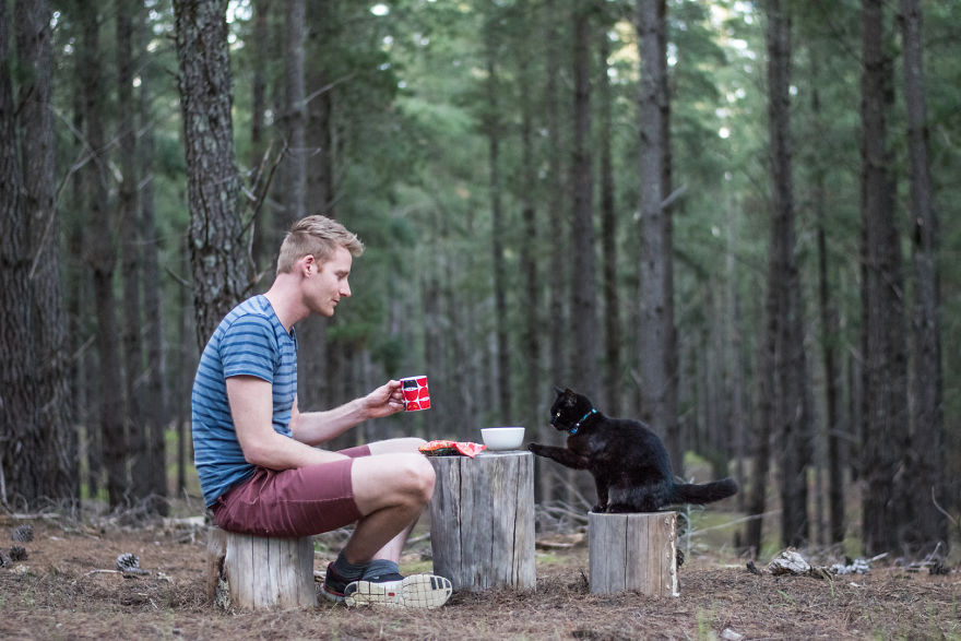 ▼沙灘上、森林中……哪裡都是家,一人一貓安逸幸福。