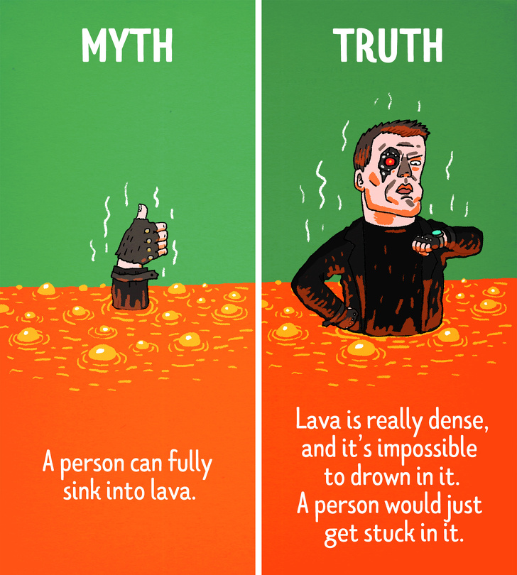 還記得《魔戒》咕嚕最終掉落熔岩後,被熔岩完全吞沒而亡的畫面嗎?科學家看到這一幕都想噗哧一笑吧?事實上,真正的熔岩非常密集,要把人淹沒根本不可能,最多只會漂浮在熱慘的表面。