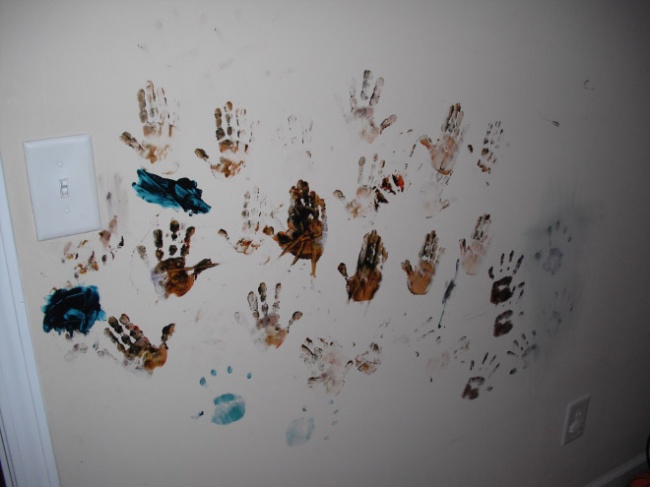 ▼有手印的牆壁更好看,爸爸媽媽不這樣覺得嗎?