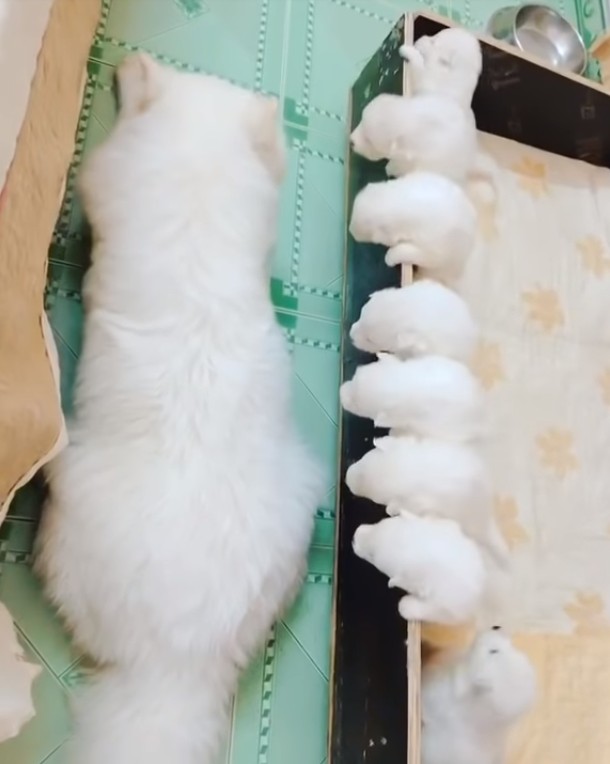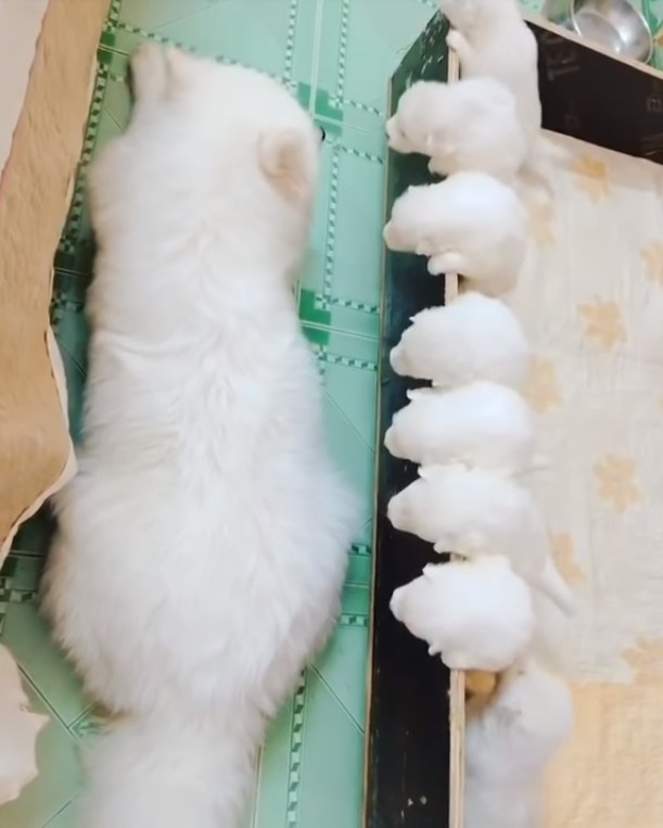 ▼影片中可以看到,狗媽媽正趴在地上一動也不動的休息,而旁邊則是八隻剛出生不久的小狗狗,正齊聚在箱子的邊緣,不斷的呼喚著媽媽。
