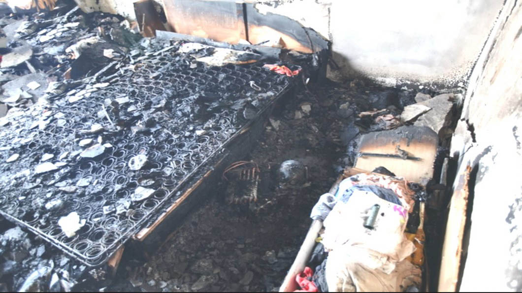 ▼其中一起火警發生時,房間燒得面目全非,連床鋪都燒成黑糊糊的一團,公寓內不斷竄出濃煙,住戶掩著口鼻趕緊疏散。警消到場後馬上架水線撲滅火勢,附近的住戶表示:「我們在看電視,等我出來的時候打開一個縫,已經那個黑煙就感覺很嗆鼻子。」