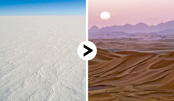 ▼​世界上最大的沙漠位於南極洲:沙漠指的是幾乎沒有水、雨、雪,樹木或植物的乾燥地區。寒冷的地方也可以出現這樣的情況,所以面積足足有540萬平方英里的南極沙漠才是世界上最大的沙漠。撒哈拉沙漠只排第三名。
