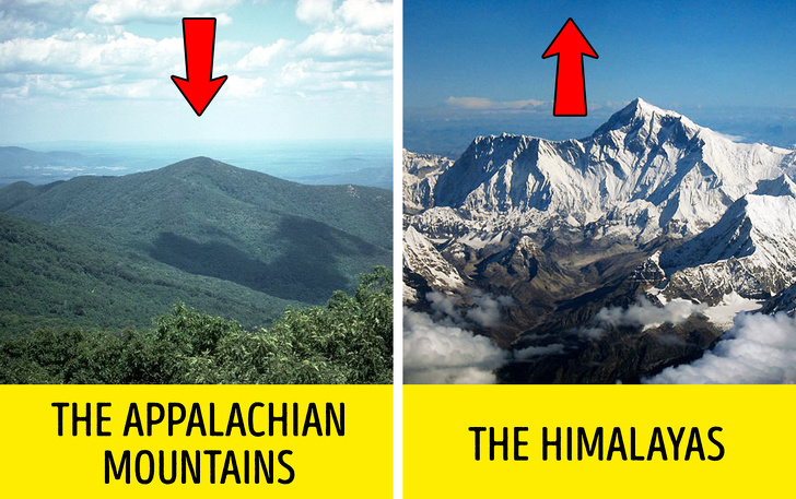 ▼​阿巴拉契亞山脈越來越矮,喜馬拉雅山越來越高:阿巴拉契亞山脈位於北美東部,高度為6,684英尺。與喜馬拉雅山脈 (29,029英尺) 相比,它們的高度並不高。但是有一段時間,阿巴拉契亞山脈比喜馬拉雅山還高。不過喜馬拉雅山更年輕,因為印度洋的板塊運動繼續給亞洲大陸帶來巨大的壓力,所以它的高度仍在增加。阿巴拉契亞山脈沒有任何力量推動,所以不會長高。