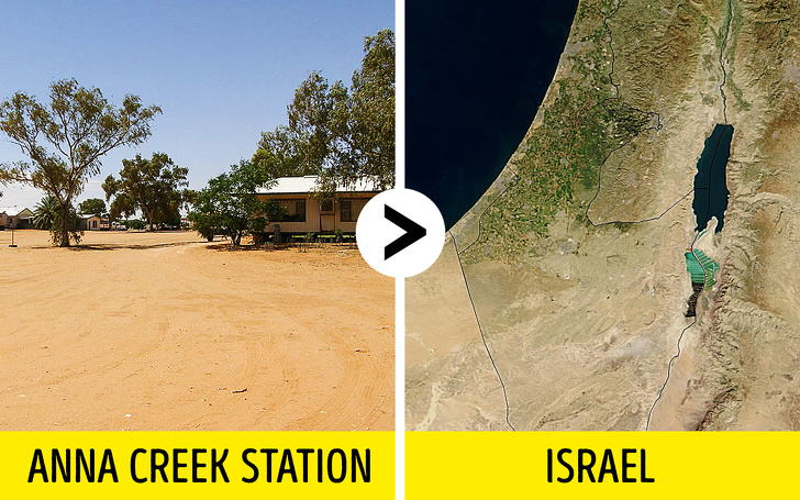 ▼​澳洲最大的安娜溪養牛場比以色列的領土還大:安娜溪養牛場是世界上最大的養牛場,面積約9,142平方英里,而以色列面積則是8,019至8,522平方英里。這個養牛場成立於1863年。