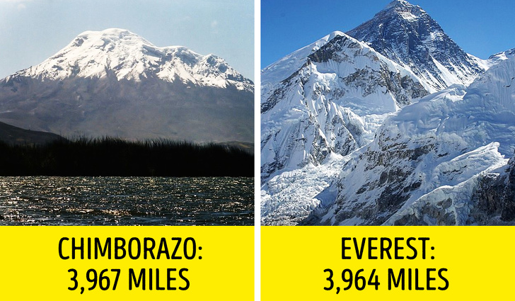 ▼​珠穆朗瑪峰不是世界最高峰:從地球中心測量山峰的高度,欽博拉索火山比珠穆朗瑪峰高一點。欽博拉索火山是3,967英里,珠穆朗瑪峰則是3,964英里。 但測量海拔高度的話,珠穆朗瑪峰就高29,029英尺。 如果在地球中心測量各大山峰的高度,珠穆朗瑪峰甚至不會出現在世界上20大最高峰的列表中。