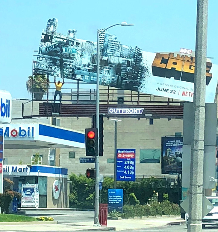 ▼14. 美劇「盧克凱吉」的宣傳!力量人直接舉起自己的廣告牌~