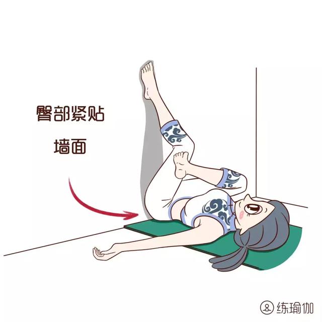 ▼仰臥坐角式:將瑜伽墊短邊放在牆邊,躺在墊子上,雙腿、臀部靠牆向上伸展。呼氣,雙腿慢慢向外打開適當的距離,雙手平展放在身體的兩側,保持4-6個深緩呼吸。
