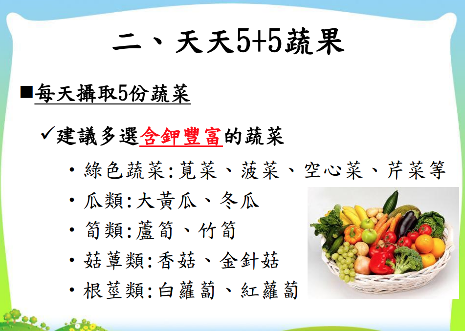 ▼吃很多的蔬菜可以讓身體裡多餘的鈉被排出來,也可以幫助維持血壓和去水腫。那要吃那一種菜,效果最好呢?你可以選擇的有旱芹、空心菜、青花椰菜、地瓜葉和綠蘆筍,這些都是鉀含量豐富的蔬菜!