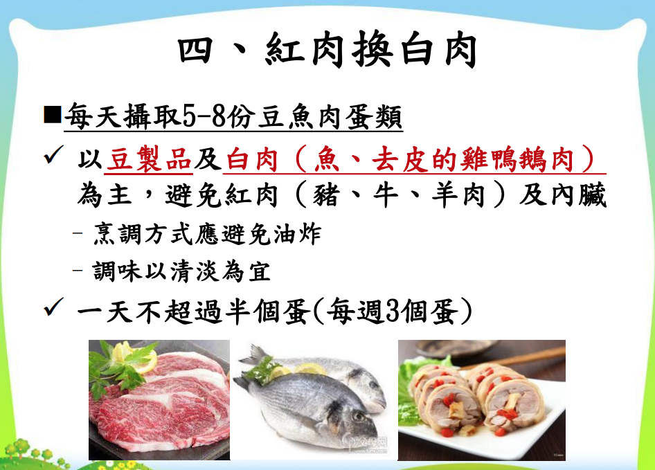 ▼肉類只吃白肉。一定要避開羊、牛、豬,內臟類更是碰不得!堅持吃雞、鵝、鴨以及魚類,你身體攝取的飽和脂肪酸的量就會降低。