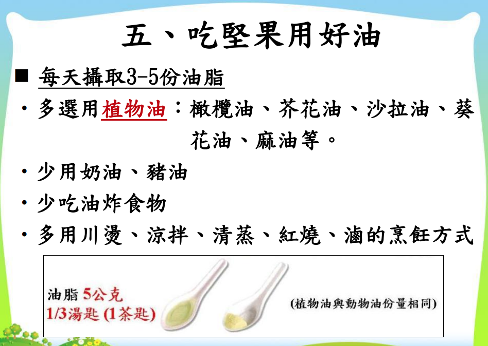 ▼多吃堅果、堅持用好油。想要控制血壓,就一定要多攝取不飽和脂肪酸,而堅果內含有鎂離子,可以幫助降血壓。油的部分則要選用葵花油、橄欖油等,只有這些好油才能幫助降低壞的膽固醇。