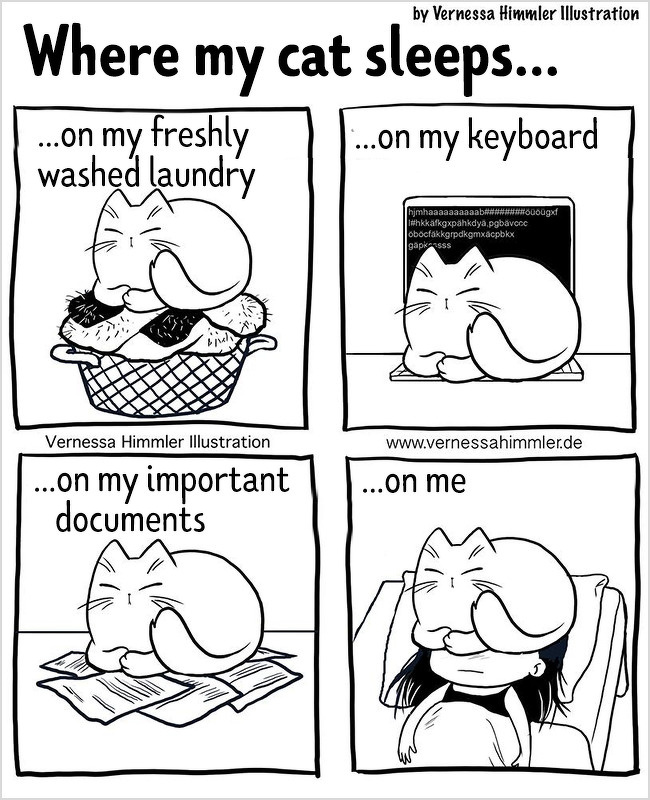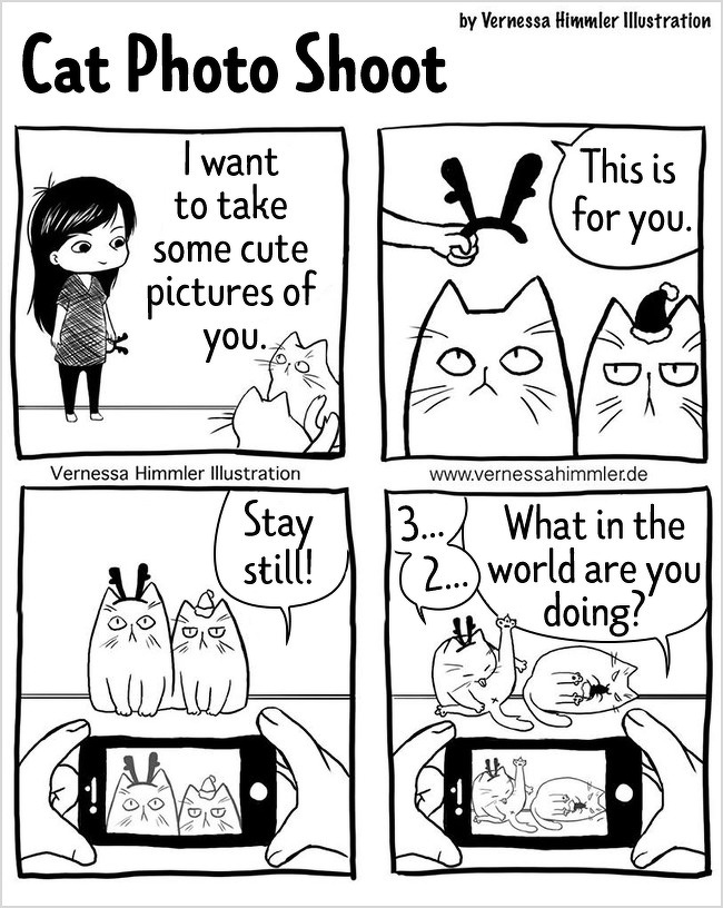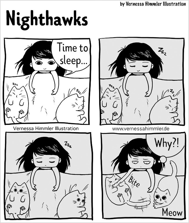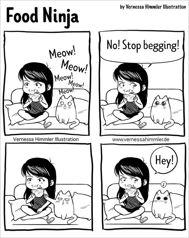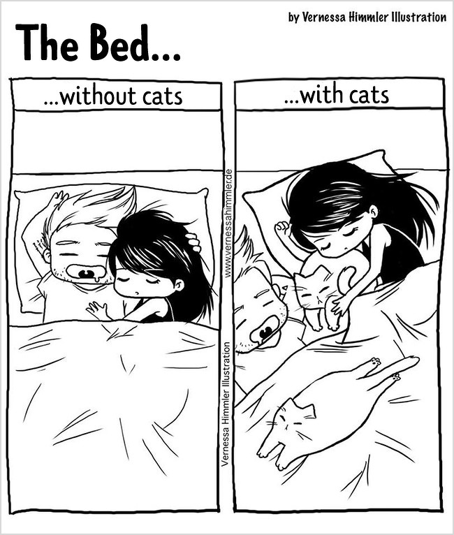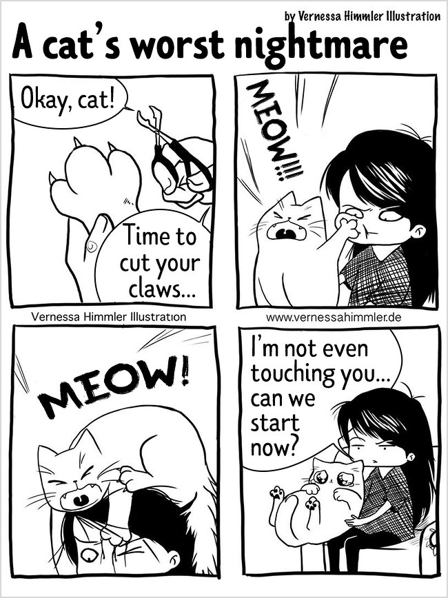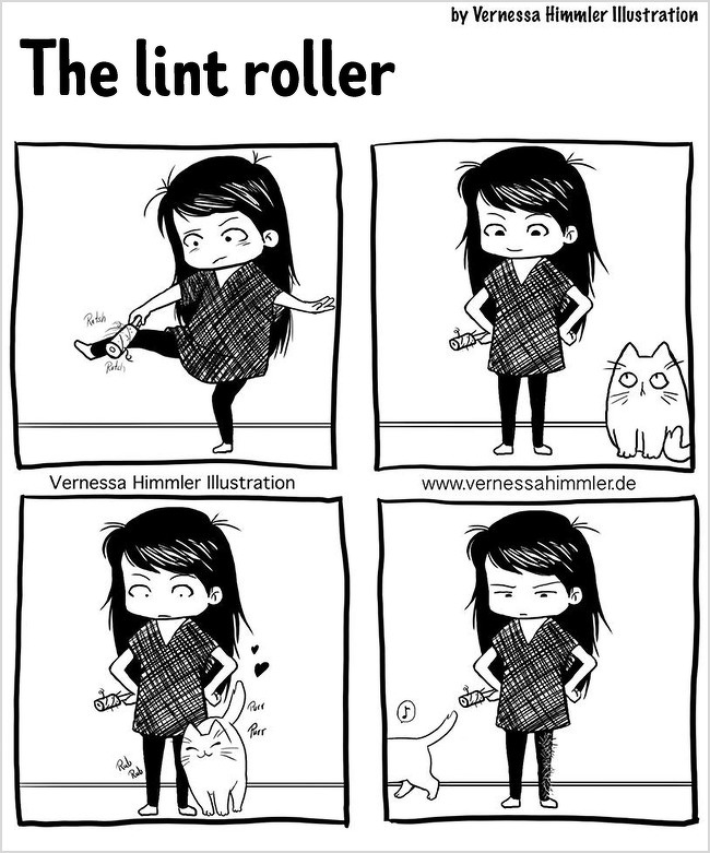 2018年12月10日每個養貓的人都深有體會,儘管喵咪的任性和調皮有時候讓你抓狂,但當擁牠們入懷的那種療癒感是無法替代的,德國藝術家Vernessa Himmler就將對家中兩隻貓咪又愛又恨的感情,用插畫的方式表達出來,也許每個貓奴都能從中找到自己的影子。