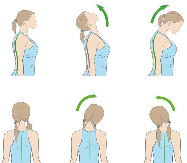 ▼頸部伸展運動:慢慢低頭,下巴收向胸口,停留15秒;慢慢仰頭,停留15秒,重複10次。將頭偏向左側、右側,同樣練習10次。
