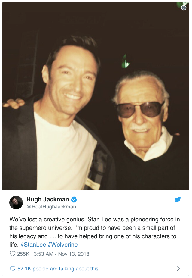 「這個世界再也不會有另一個史丹李了。幾十年來,他一直為各個年齡層的人提供了冒險、舒適、自信、啟發、力量、友情和快樂。他留下的愛和善良將會一直永存大家的心中!」