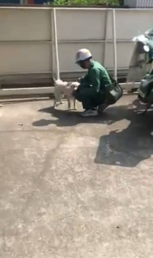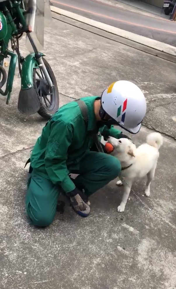 ▼蛋白一聽到熟悉的機車引擎聲,馬上開心得不斷哼叫,郵差一蹲下撫摸牠時,牠還整個身體撲過去討摸狂蹭!