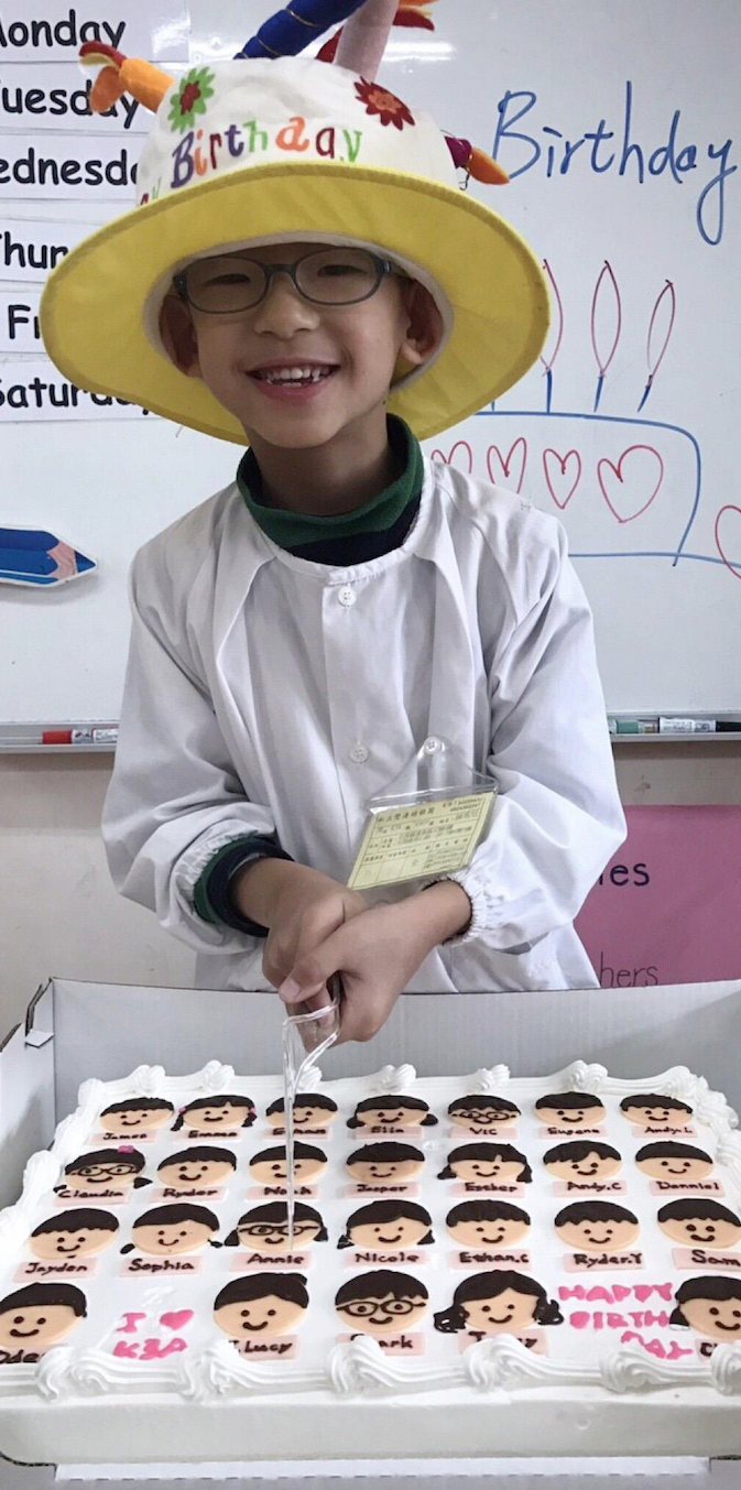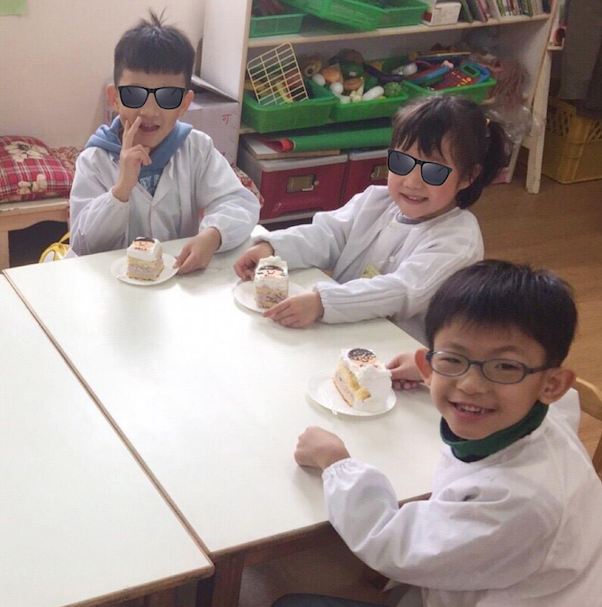 ▼兒子跟同學們一起在教室裡吃「自己人臉」的蛋糕,他們都覺得超有趣又好玩~