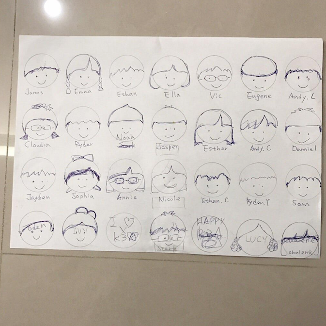 ▼神人媽媽先把26個小朋友的臉畫草稿,髮型更是對著照片一個一個地弄,一點也不馬虎呢!