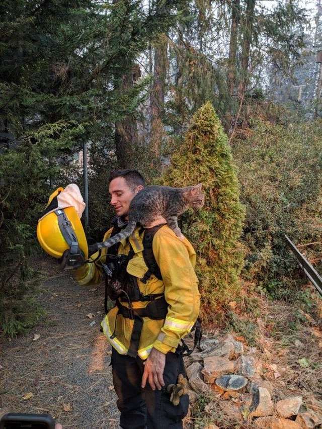 我的英雄~ 貓咪逃出加州大火 緊趴消防員肩頭「要跟他當麻吉」