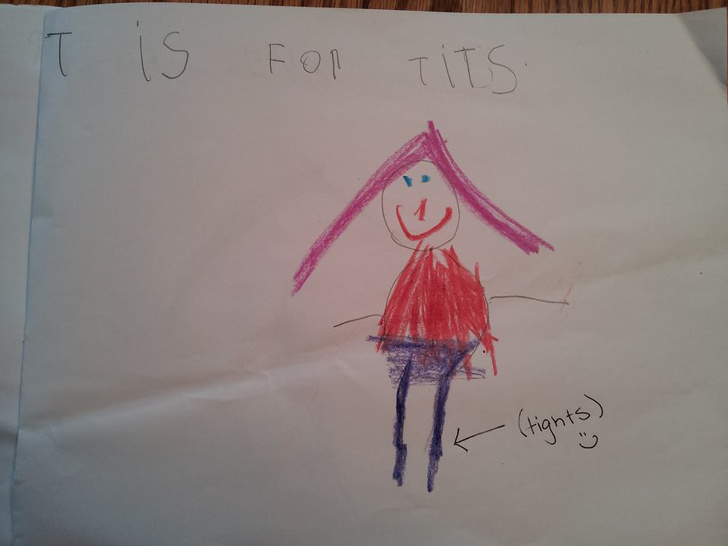 ▼題目:「請用字母作畫,並解釋其含義。」、學生圖解:「『T』在我的畫中代表奶頭(Tits)。」   但她想說的其實是緊身褲(Tights)…