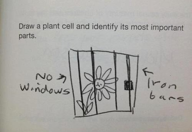 ▼圖解題:「請畫出一個植物細胞(plant cell),並識別出它最重要的部位為何?」( Plant中文為植物,但Cell字面翻譯除了細胞,也同「牢房」一詞。)