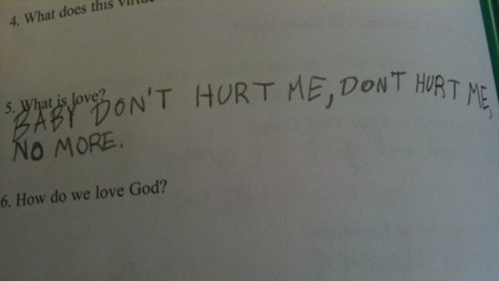 ▼簡答題:「什麼是愛?」、學生作答:「寶貝~請不要再讓我心碎~~~(怎麼又在唱歌了啦!)」