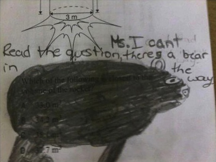 ▼學生:「老師,我看不清楚題目,因為有一隻大黑熊擋住了。」