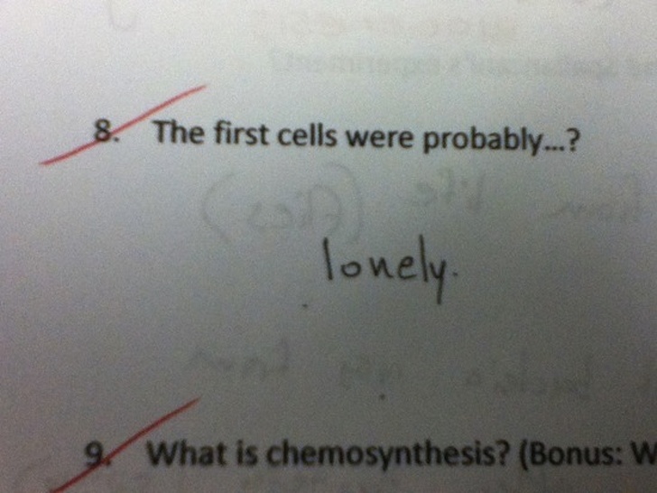 ▼問答題:「請問第一個細胞(cell)應該是…?」、學生作答:「孤單。(因為cell翻譯同牢房)」(你是寂寞先生嗎…)