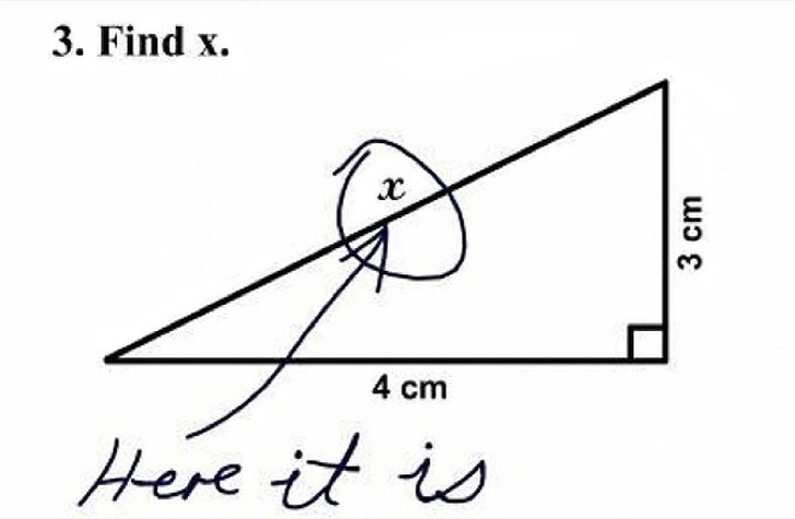 ▼應用題:「請解出圖中『X』的數質。」、學生作答:「就在這裡。」(竟然還把它圈起來,笑翻~)