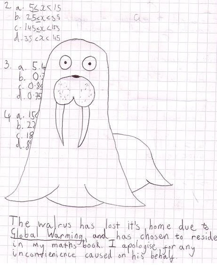 ▼無庸至疑,這很明顯是一份數學作業。但學生竟然畫了一幅圖,並用文字在底下向老師解釋:「這隻海象因為地球暖化的關係,失去了牠的棲息地,並選擇了我的數學作業簿,當作遷移徒居的新家。如果因為牠的行為而造成任何不便,我在此替牠深深地向您說聲抱歉。」(只能說這創意有強大到XD)