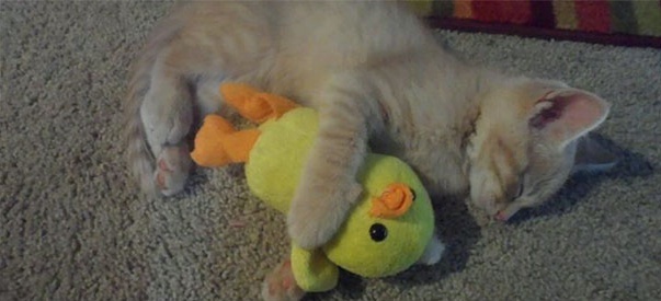 ▼抱著小黃鴨入睡的貓咪。
