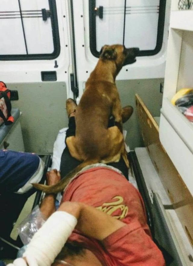 ▼這隻名叫馬龍(Marrom)的狗狗在流浪漢病發後就一直陪在他身旁,不願離去。當醫護人員趕到時,看到的就是馬龍守護在主人身旁的場景。好心的醫護人員知道馬龍非常擔心主人,所以沒有把牠趕到一旁,而是讓牠乘著救護車一同隨行。
