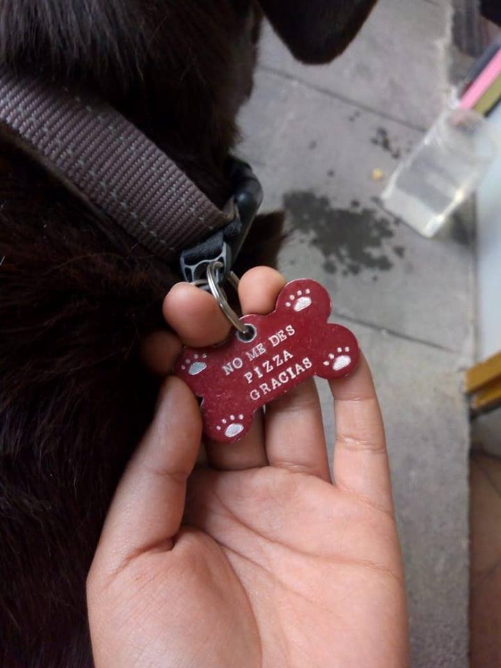 ▼於是她步出店外,摸了摸溫馴又乾淨的圓潤汪汪,發現牠脖子上有頸圈,並看了吊牌上的刻文。「果不其然,差一點就被你匡啦!」原來這隻汪汪是家犬,且早已不知練習過幾百遍,每天都用著同一招在披薩店外騙吃騙喝。對此,不喜歡限制汪汪活動範圍的主人也早有對策,直接在辨識牌上寫著:「請不要餵我吃披薩,謝謝。」