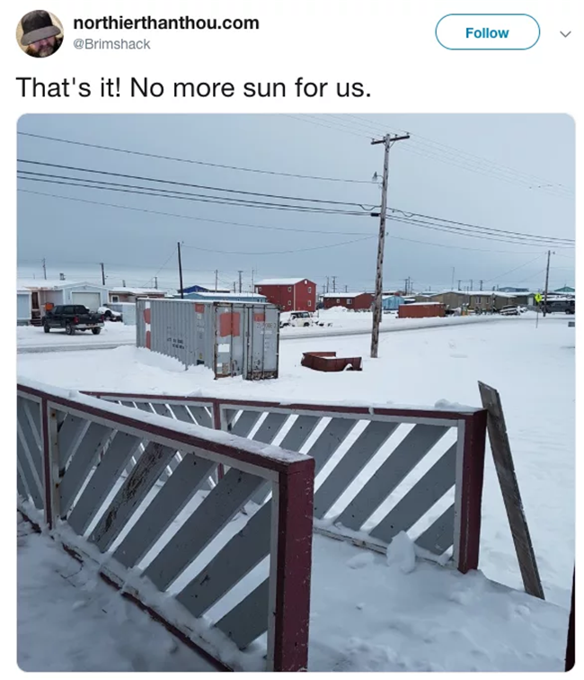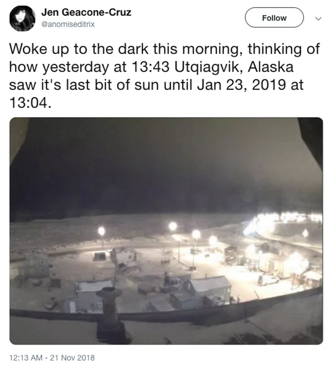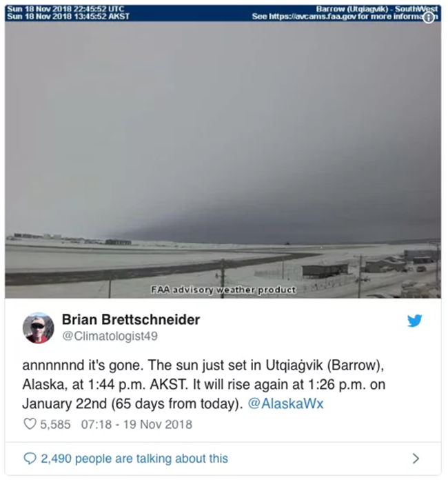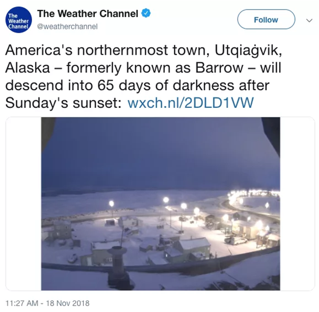 2018年11月24日我們常說「不管發生什麼事,明天太陽依舊會升起」,然而位於美國阿拉斯加最北端的Utqiaġvik小镇卻顛覆了這個常識,這裡的人們在未來的兩個月中都會看不到任何陽光,直到2019年1月23日,這也意味著他們將生活在黑暗中長達65天。