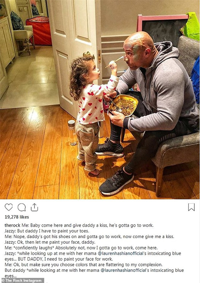 2018年11月24日好萊塢的動作明星巨石強森(Dwayne Johnson)向來以硬漢角色聞名,但私底下卻是個不折不扣的女兒奴,對於女兒可以說是有求必應,日前他在Instagram上發布了一張女兒在自己臉上塗鴉的照片,讓網友們看到了他鐵漢柔情的一面。