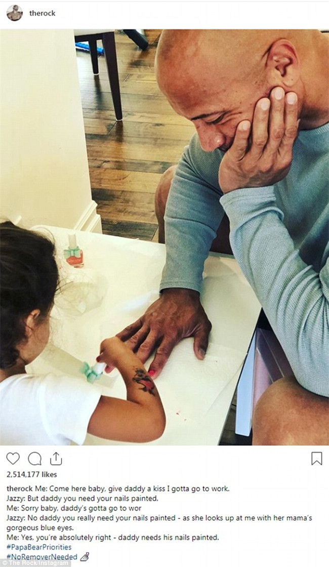 ▼在9月巨石強森也分享過一個類似的帖文,同樣是要出門工作的他被女兒叫住,要幫他涂指甲,於是他就順從的坐在那裡任由女兒擺佈,給他塗上了鮮艷的指甲油,他還手托腮幫,一臉享受的表情。