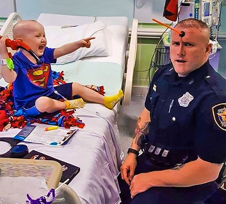 ▼2.警察先生的陪伴讓小男孩超開心,康復速度也變快了!