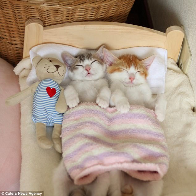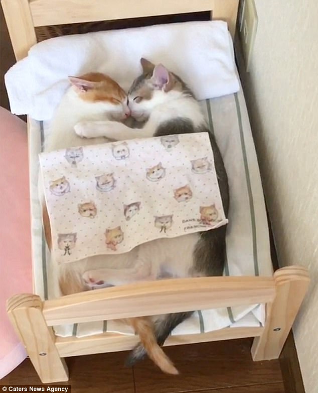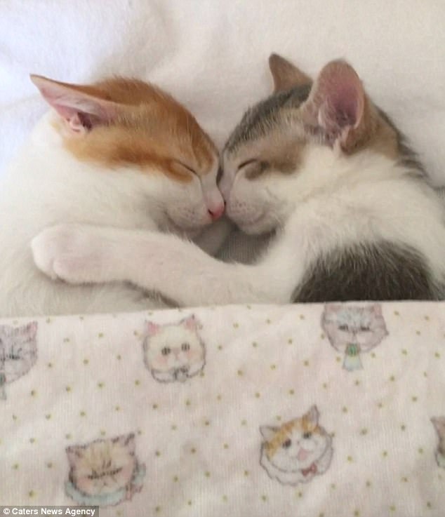 ▼除了白天形影不離,晚上睡覺時牠們也要挨在一起。Rie表示,除非抱在一起,否則牠們睡不著。為了讓這對相親相愛的貓兄妹睡個好覺,Rie專門準備了一張小床。牠們緊緊擁抱,頭靠在一起,旁邊還擺著泰迪熊娃娃的樣子萌化人心。