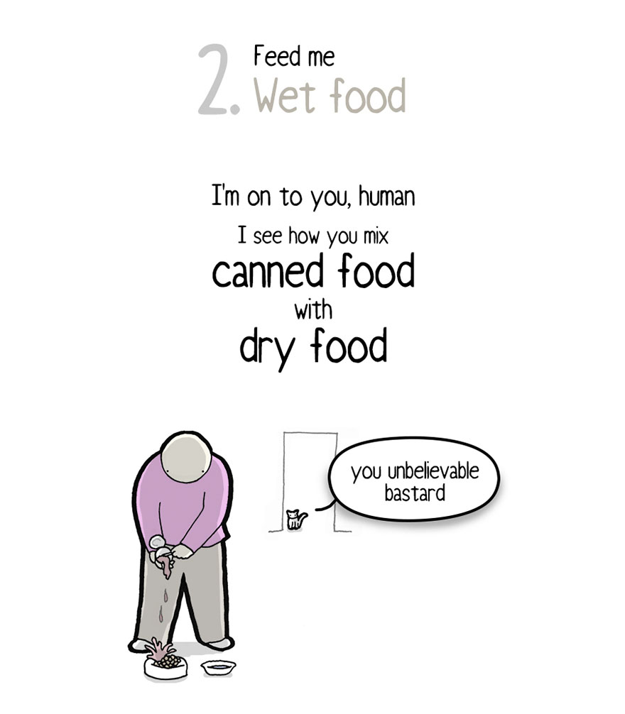 哼!我看到你往我的貓糧里放罐頭了。你這個混蛋!我想要每天都吃濕的食物,最好是在週末能給我來份蜂蜜烤鮭魚~