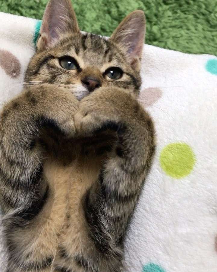 很多人拍照時會用手指比愛心。這個姿勢很可愛,但說到比愛心賣萌的最高境界,還是要看貓主子。粉絲專頁Fluffy 寵毛孩po出了一段影片,只見一隻貓咪仰躺著,兩隻前爪自然彎曲,手碰手比出了大大的愛心!