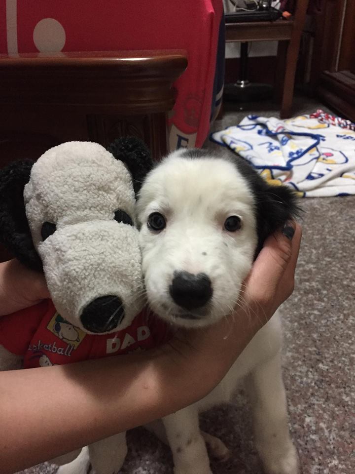 前幾天,一名網友在臉書社團「米克斯傳奇」分享了幾張照片,希望大家幫剛剛領養的狗狗取名字。這隻狗狗全身雪白,耳朵是黑色的,背上也有黑色的斑點,看起來與卡通角色「史努比」一模一樣。