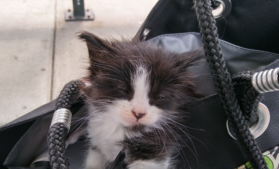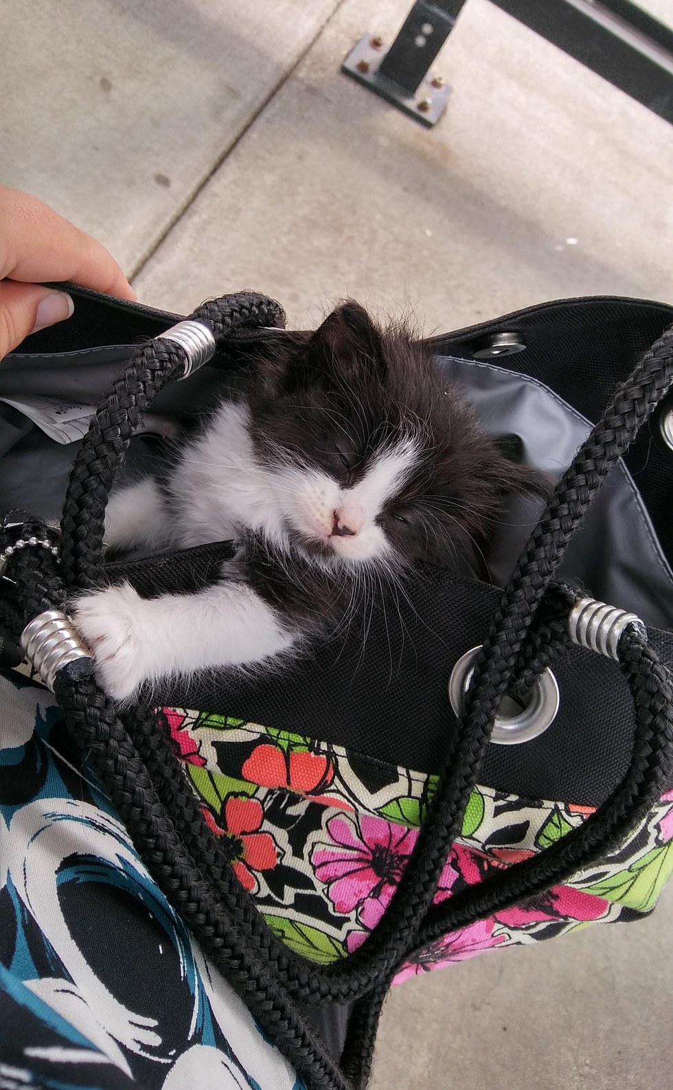 ▼接下來小貓乖乖睡在她的包包裡,他們就這樣待了一整天。Kayla覺得這就是緣分:「我覺得爆胎真是太好了,因為這樣才遇到這麼幸運的事!」