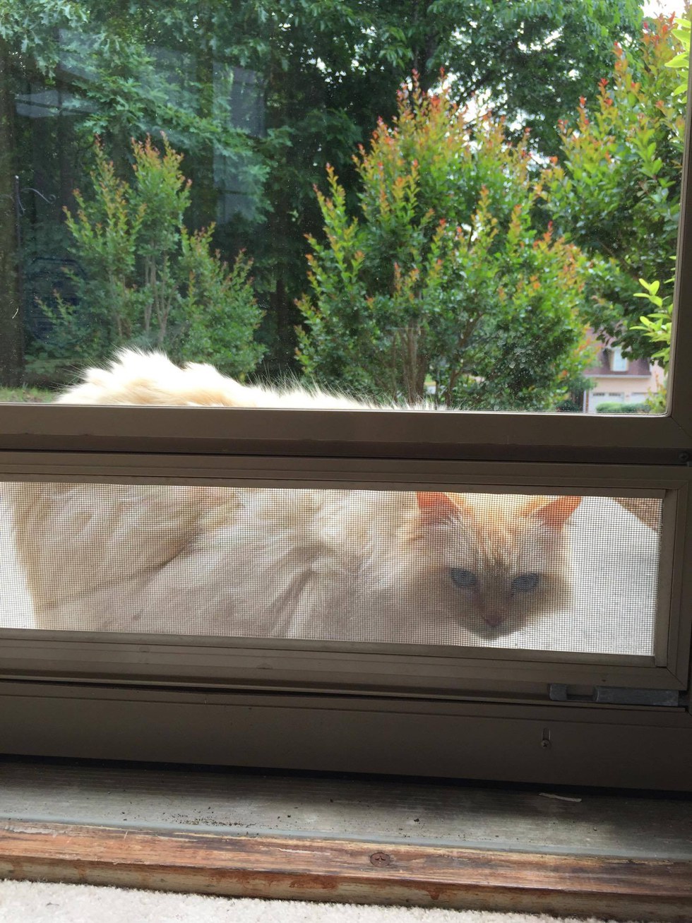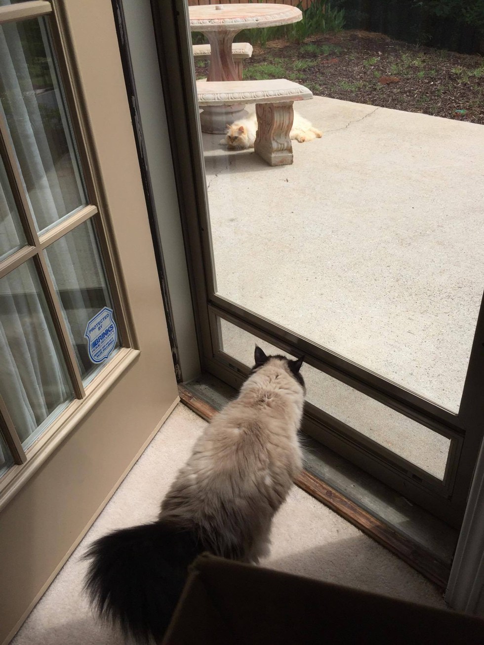 ▼勞拉後來得知這是鄰居的貓辛巴(Simba),辛巴常來他們的後院玩耍,而她養的貓艾拉(Ella)就會在門前盯著牠,讓勞拉覺得是相當有趣的景象。